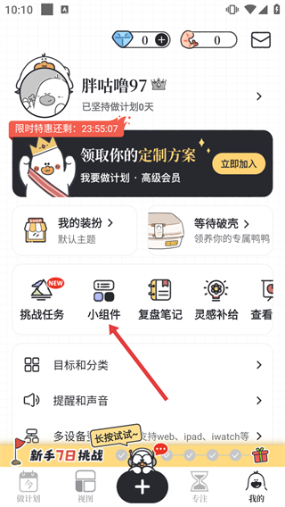 2、進(jìn)入個(gè)人中心頁面后,選擇功能區(qū)中的【小組件】選項(xiàng),進(jìn)入組件選擇頁面。
