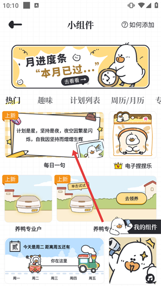 3、在小組件頁面的“熱門”分類下,點(diǎn)擊【每日一句】組件條目,進(jìn)入該組件的詳情配置界面。