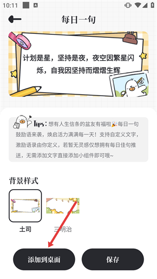 4、在“每日一句”詳情頁選擇偏好的背景樣式后,點(diǎn)擊【添加到桌面】按鈕,即可將該激勵(lì)組件添加至手機(jī)桌面。