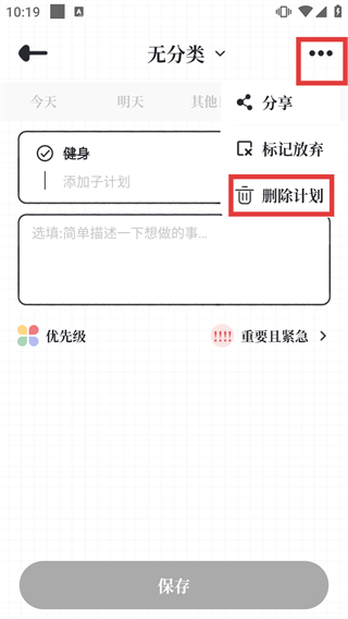3、在計劃詳情界面,點擊右上角的三點圖標,展開操作菜單后選擇【刪除計劃】選項。