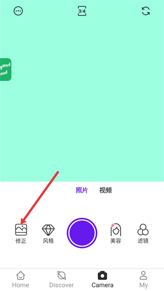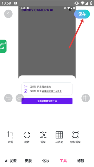 2、進入相機界面后,點擊左下角的【修正】按鈕,觸發(fā)服務條款與隱私政策的確認彈窗。