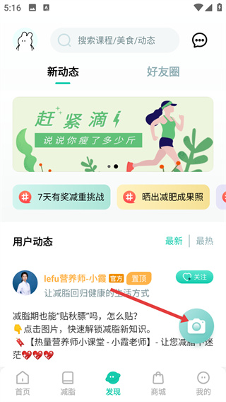 1、進(jìn)入首頁后,點(diǎn)擊底部【發(fā)現(xiàn)】選項(xiàng),切換至發(fā)現(xiàn)板塊,可瀏覽新動(dòng)態(tài)、用戶分享的減脂內(nèi)容等資源。