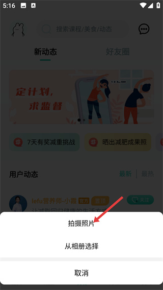 3、在彈窗中選擇【拍攝照片】(也可選擇“從相冊(cè)選擇”),獲取發(fā)布動(dòng)態(tài)所需的圖片素材。