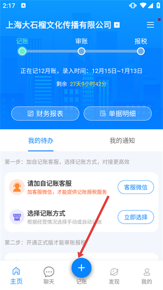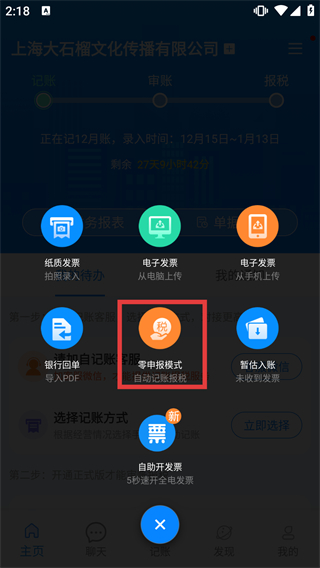 1、在記賬頁(yè)面點(diǎn)擊底部【記賬】按鈕,可展開(kāi)含紙質(zhì)發(fā)票-電子發(fā)票-零申報(bào)模式等功能的操作選項(xiàng)。