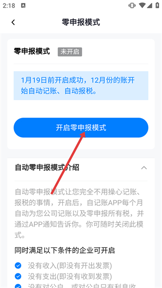 3、進(jìn)入【零申報(bào)模式】頁(yè)面,1月19日前點(diǎn)擊【開(kāi)啟零申報(bào)模式】,12月份的賬可自動(dòng)記賬-自動(dòng)報(bào)稅。