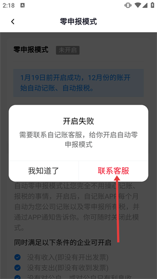 4、若開(kāi)啟零申報(bào)模式失敗,彈窗提示需聯(lián)系自記賬客服,點(diǎn)擊【聯(lián)系客服】即可對(duì)接開(kāi)啟該模式的相關(guān)處理。