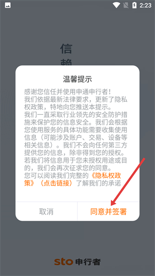 1、在【申通申行者】的溫馨提示彈窗,閱讀【隱私權(quán)政策】后,點擊【同意并簽署】按鈕,即可進入后續(xù)操作界面。