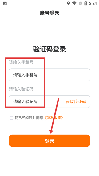 2、進入【賬號登錄】的【驗證碼登錄】界面,依次填【請輸入手機號】-【請輸入驗證碼】,勾選隱私政策后點【登錄】。