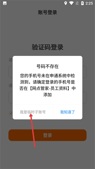 3、若登錄時彈出【號碼不存在】提示,說明手機號未在系統(tǒng)添加,可選擇【我是臨時子賬號】選項繼續(xù)操作。