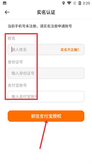 4、進入【實名認證】頁面,填寫【姓名】-【身份證號】-【支付寶賬號】后,點擊【前往支付寶授權(quán)】完成實名注冊。