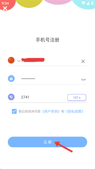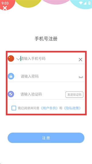 2、在【手機號注冊】頁后,依次填寫【請輸入手機號碼】、密碼、驗證碼,勾選【用戶條例】和【隱私政策】,準備完成注冊步驟。