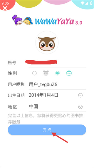 4、注冊后進入【W(wǎng)aWaYaYa-3.0】的賬號信息頁,完善性別、用戶昵稱、出生日期、地區(qū),點擊【完成】即可獲取貼心圖書推薦服務。
