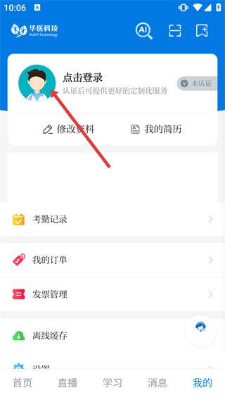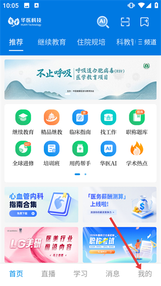 1、在掌上華醫(yī)首頁,可查看繼續(xù)教育-臨床指南等功能模塊,點擊底部“我的”選項,進入個人相關(guān)功能頁面。