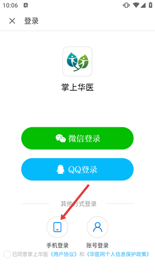 3、在登錄方式選擇頁面,選擇“手機登錄”選項,進入對應(yīng)的驗證碼登錄/注冊的操作頁面。