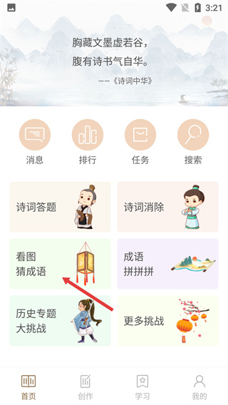 1、在首頁找到【看圖猜成語】功能入口,該頁面還有【詩詞答題】、【成語拼拼拼】等趣味詩詞相關(guān)模塊。