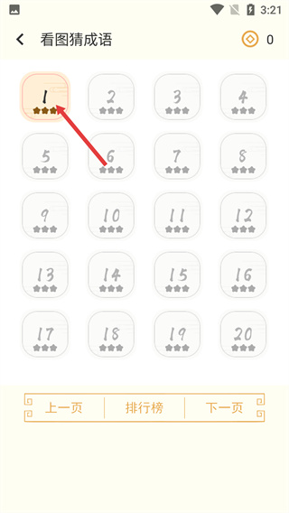 2、進(jìn)入【看圖猜成語】后,選擇【1】關(guān),可通過【上一頁】、【下一頁】切換關(guān)卡列表。