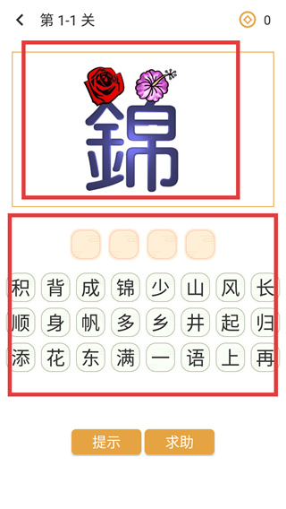 3、在【第1-1關(guān)】答題界面,根據(jù)上方圖案提示,從下方字庫中選字組成對應(yīng)成語,可使用【提示】功能輔助答題。