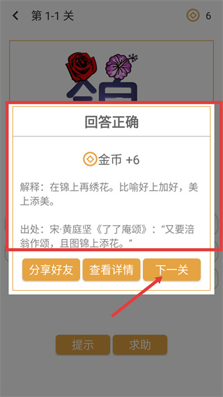 4、回答正確后會(huì)獲得【金幣+6】,同時(shí)顯示成語解釋與出處,點(diǎn)擊【下一關(guān)】可繼續(xù)挑戰(zhàn)后續(xù)關(guān)卡。