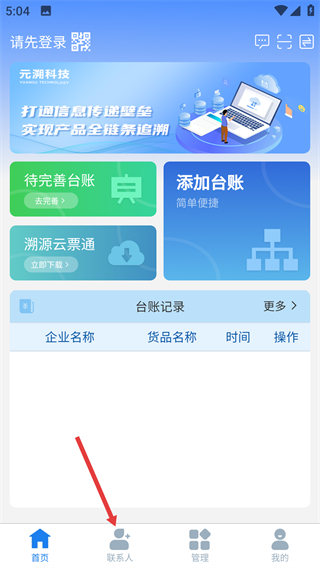1、進(jìn)入【元滿(mǎn)科技】首頁(yè),找到【待完善臺(tái)賬】-【添加臺(tái)賬】-【溯源云票通】功能,點(diǎn)擊底部【聯(lián)系人】進(jìn)入對(duì)應(yīng)頁(yè)面。