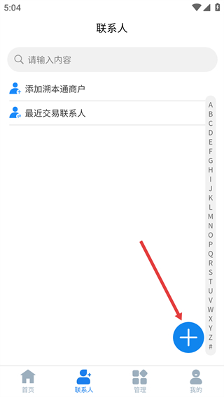 2、在【聯(lián)系人】頁(yè)面,可通過(guò)搜索框查找內(nèi)容,點(diǎn)擊【添加潮本通商戶(hù)】-【最近交易聯(lián)系人】,或點(diǎn)藍(lán)色加號(hào)新增聯(lián)系人。