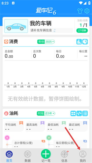 1、進入【愛車記6】首頁,查看【我的車輛】模塊,補充車輛信息后,點擊底部【我的】按鈕進入對應(yīng)頁面。