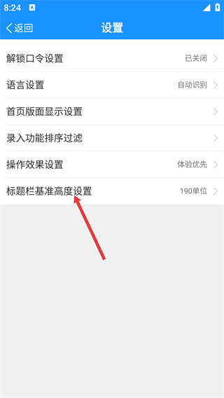 3、在設(shè)置頁面,找到【標(biāo)題欄基準(zhǔn)高度設(shè)置】選項,當(dāng)前顯示【191單位】,點擊進入該功能的配置界面。