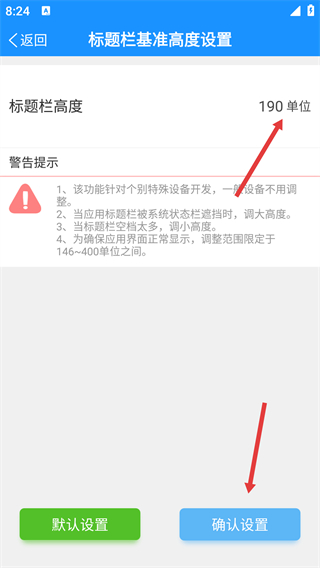 4、在【標(biāo)題欄基準(zhǔn)高度設(shè)置】頁面,查看警告提示后,調(diào)整高度至146-400單位間,點擊【確認(rèn)設(shè)置】完成配置。