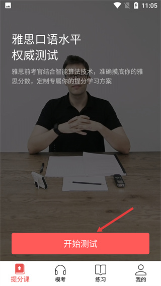 1、進(jìn)入雅思口語水平權(quán)威測(cè)試頁面,點(diǎn)擊【開始測(cè)試】按鈕,啟動(dòng)前考官結(jié)合智能算法的口語水平測(cè)試流程。