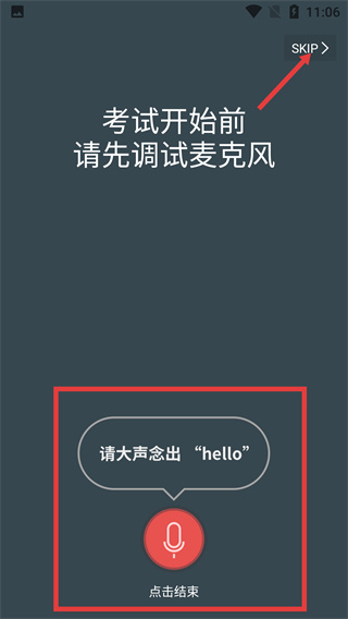 2、測(cè)試啟動(dòng)后進(jìn)入麥克風(fēng)調(diào)試頁,可按提示念“hello”調(diào)試,也能點(diǎn)擊【SKIP】按鈕跳過該調(diào)試環(huán)節(jié)。