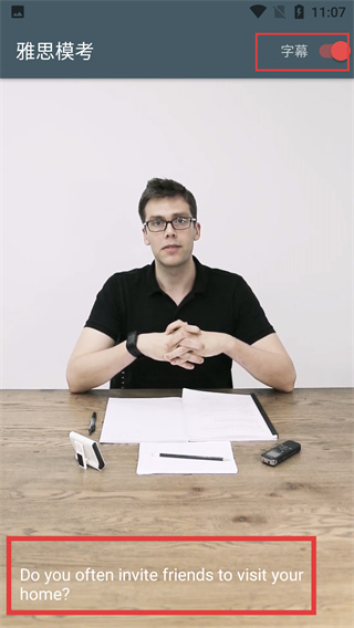 3、進(jìn)入雅思模考環(huán)節(jié),可開啟【字幕】功能輔助查看題目,依據(jù)頁面顯示的口語問題準(zhǔn)備作答內(nèi)容。