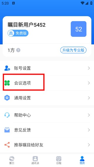 2、在個(gè)人中心頁面,找到“會(huì)議選項(xiàng)”選項(xiàng)并點(diǎn)擊,進(jìn)入會(huì)議相關(guān)的設(shè)置頁面。