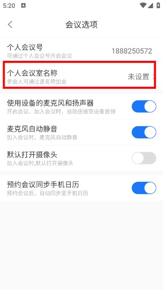 3、在會(huì)議選項(xiàng)頁面,點(diǎn)擊“個(gè)人會(huì)議室名稱”選項(xiàng),進(jìn)入會(huì)議室名稱的設(shè)置頁面。