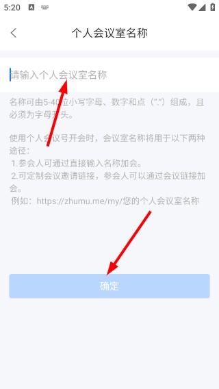 4、在個(gè)人會(huì)議室名稱設(shè)置頁面,輸入符合格式要求的名稱后,點(diǎn)擊“確定”按鈕完成會(huì)議室名稱的設(shè)置。