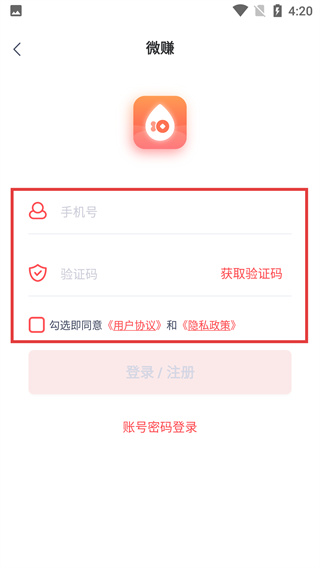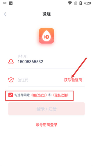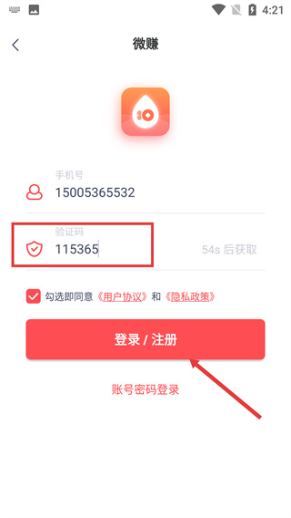 4、在驗證碼輸入框填寫獲取到的【驗證碼】后,點擊【登錄/注冊】按鈕,即可完成微賺賬號的注冊操作。