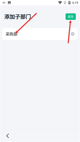 4、在【添加子部門】界面的輸入框填寫【采購部】,完成后點(diǎn)擊右上角【保存】即可完成子部門創(chuàng)建。