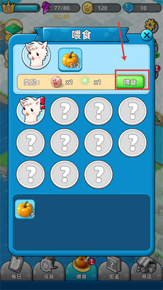 1、在【喂食】界面中,點(diǎn)擊【喂食】按鈕消耗【南瓜-5/2】,可獲取【獎(jiǎng)勵(lì)-x1】道具,推進(jìn)養(yǎng)成進(jìn)度。