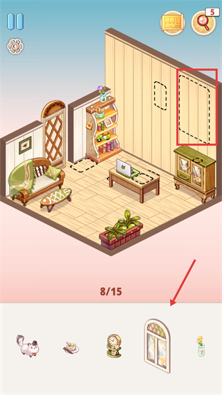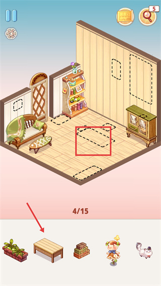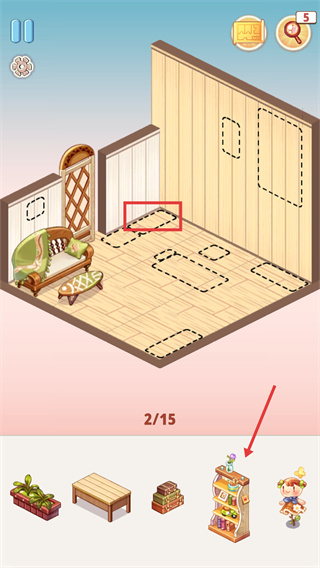 3、繼續(xù)選取下方【盆栽】,放入房間的下方,讓進(jìn)度更新為【5/15】,逐步填滿空間。