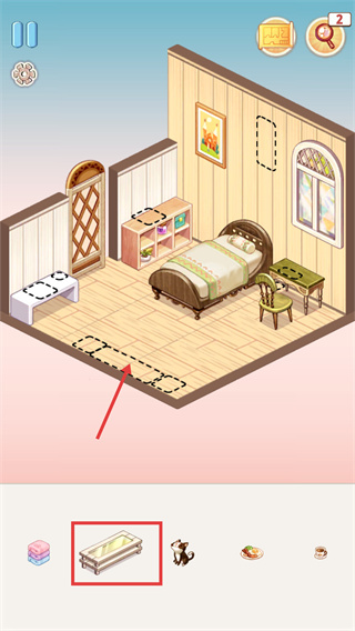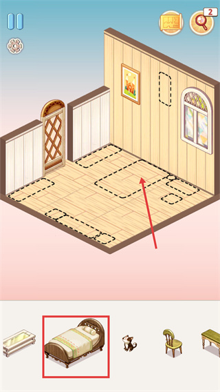 2、觀察房間內(nèi)的黑色輪廓區(qū)域,選中下方的【床】,將其拖動到對應輪廓位置完成擺放。
