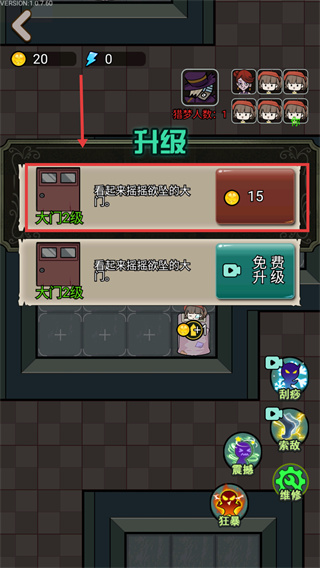 3、當(dāng)資源足夠時(shí),消耗【15】金幣可升級(jí)【大門(mén)2級(jí)】,也可選擇【免費(fèi)升級(jí)】,提升大門(mén)防御能力。