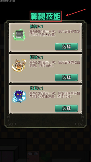 2、在【神秘技能】界面,可選【修復(fù)lv.1】恢復(fù)門血量、【招財(cái)lv.1】提升收益等技能,每局限用一次,需根據(jù)對(duì)局需求選擇。