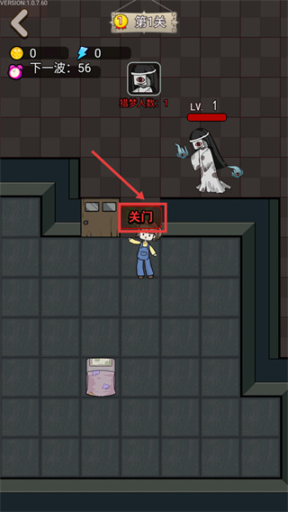 3、進(jìn)入【第1關(guān)】后,當(dāng)獵夢(mèng)人出現(xiàn)時(shí),點(diǎn)擊【關(guān)門】按鈕可阻擋其進(jìn)入,需及時(shí)操作保障自身安全。