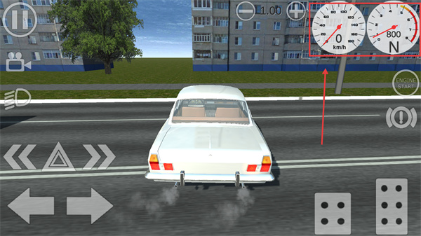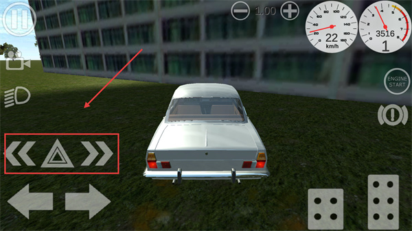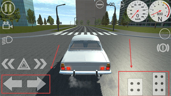 2、駕駛時(shí)利用左下角的方向按鍵控制車輛轉(zhuǎn)向,右側(cè)的按鍵可調(diào)整車輛狀態(tài),同時(shí)注意【ENGINE-START】按鈕用于啟動引擎。
