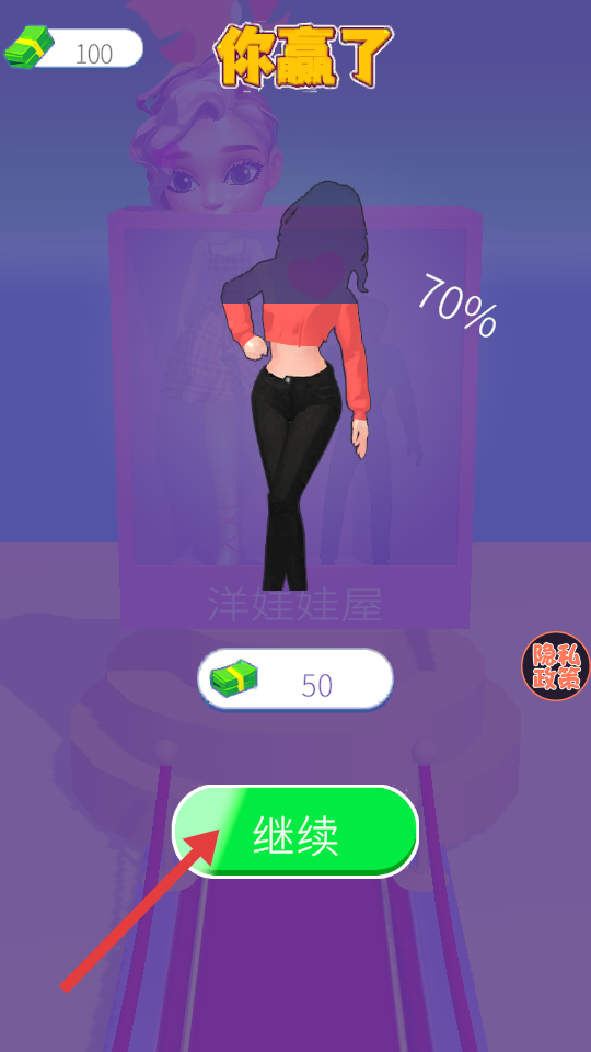 4、關(guān)卡獲勝后,點擊【繼續(xù)】按鈕,推進游戲,開啟后續(xù)的打扮挑戰(zhàn)。