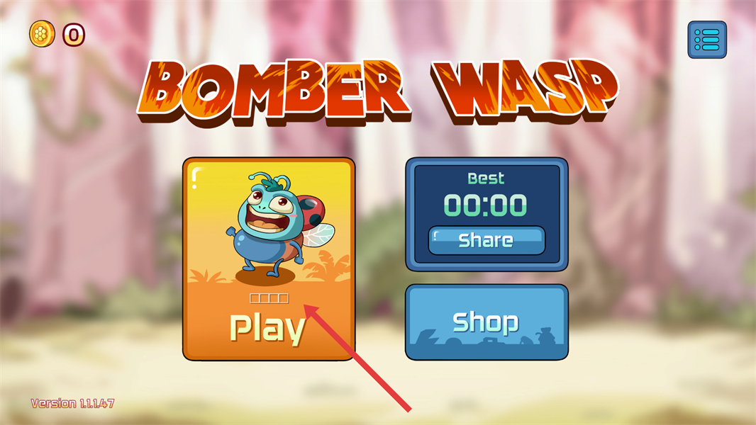 1、進(jìn)入游戲點(diǎn)擊帶有卡通昆蟲的【Play】按鈕,即可進(jìn)入【BOMBER-WASP】游戲。