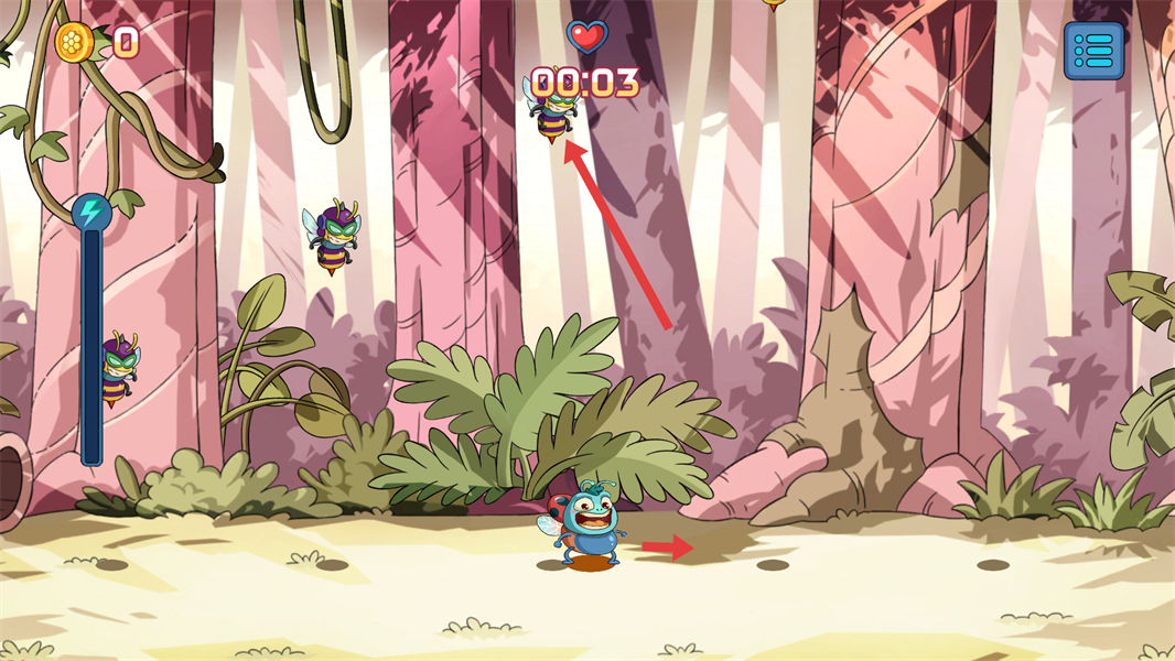 2、滑動(dòng)屏幕來操控角色左右移動(dòng),同時(shí)躲避空中出現(xiàn)的蜜蜂類敵人。