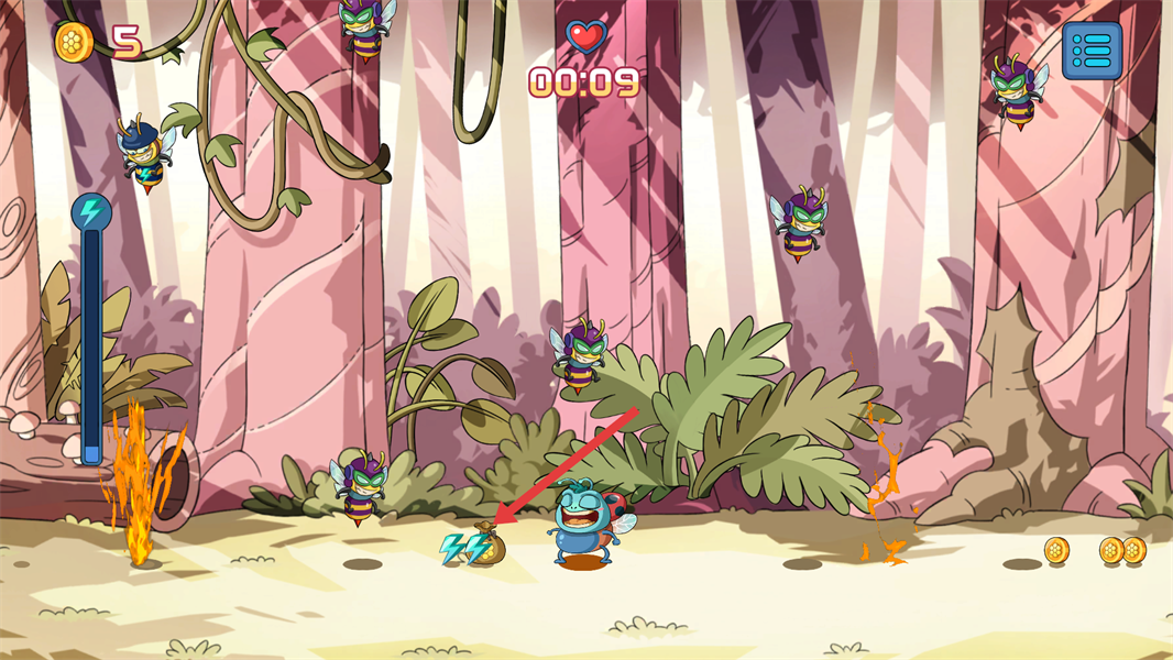 3、在游戲場(chǎng)景里,玩家需要收集帶有閃電標(biāo)志的道具,還可拾取金幣,且要避開火焰等障礙,盡可能延長(zhǎng)生存時(shí)間。