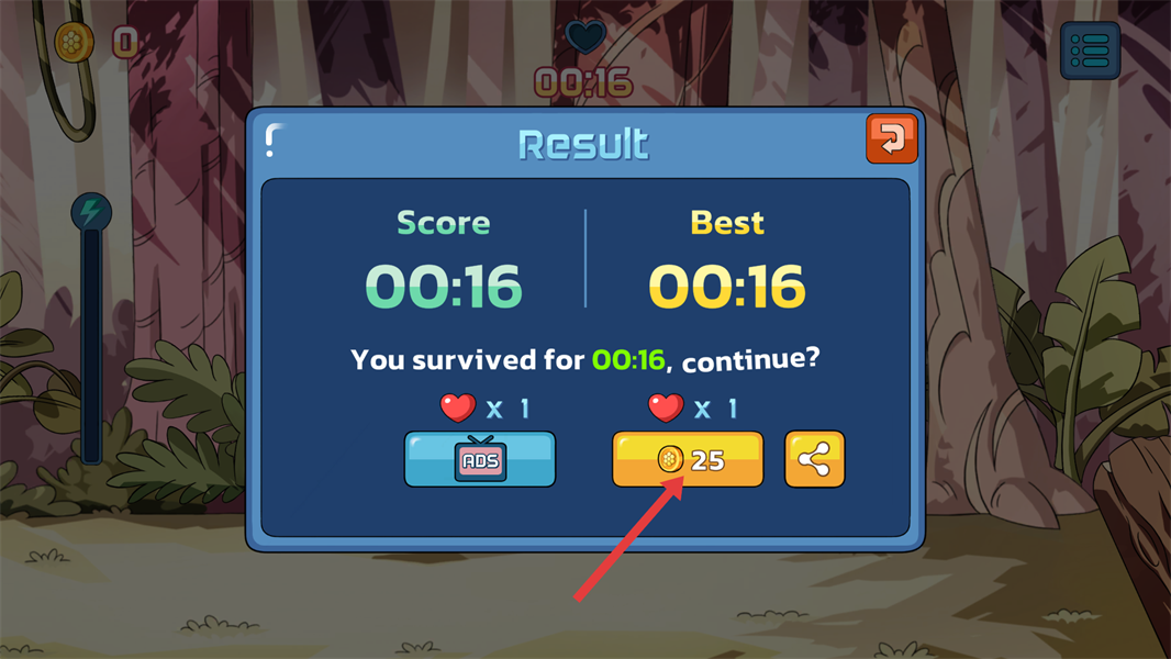 4、游戲結(jié)束后,界面會(huì)顯示【Result】以及存活時(shí)長(zhǎng),可點(diǎn)擊帶有25金幣的按鈕繼續(xù)游戲,或返回主頁重新開始游戲。