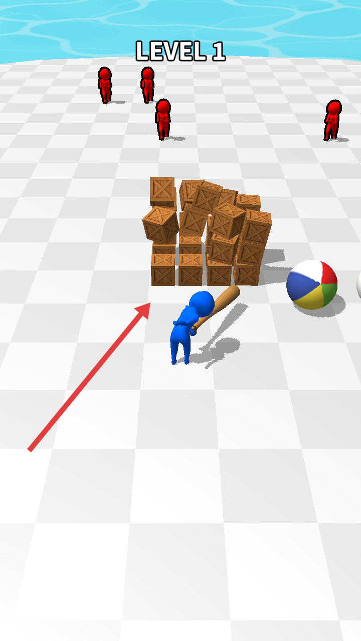 1、操控藍色持棒角色在Level1場景中移動,靠近木箱區(qū)域,準備開啟戰(zhàn)斗挑戰(zhàn)。