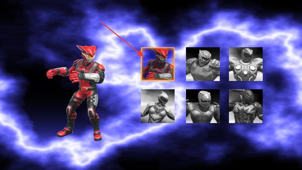 1、進入作品后,先入英雄選擇界面,選擇紅色機甲角色,準(zhǔn)備進入格斗對戰(zhàn)場景。