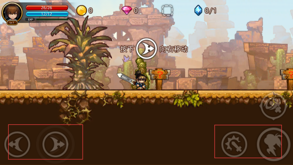 2、按提示【按下→向右移動】,操控角色移動,熟悉操作,同時留意界面技能與道具按鈕。